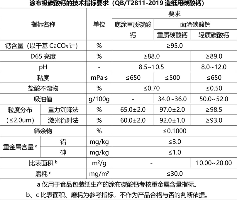 2020年4月1日,QB/T2811-2019造紙用碳酸鈣代替QB/T2811-2006造紙研磨碳酸鈣正式實施。依據(jù)標準,造紙用碳酸鈣按產(chǎn)品用途分為填料級碳酸鈣、涂布級碳酸鈣。其中填料級碳酸鈣包括重質碳酸鈣(研磨碳酸鈣)和輕質碳酸鈣(沉淀碳酸鈣),涂布級碳酸鈣包括底涂碳酸鈣和面涂碳酸鈣。
